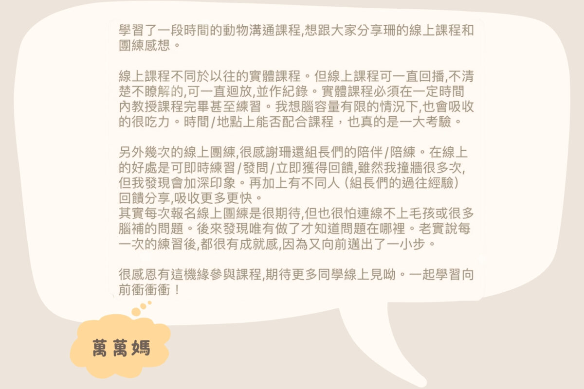 設計這堂課,是希望把這項能力用「清楚、人人皆可學會的方法教給更多人」只要你願意嘗試,都能真正聽懂毛孩的聲音。